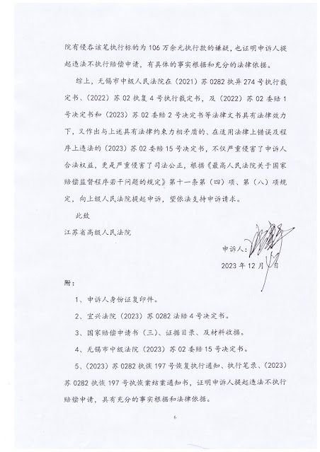 据了解,张建平先生是在2023年12月4日,因不服无锡市中级法院(2023)诉02委赔15号决定书,通过邮寄方式向江苏省高院提交国家赔偿申诉书及相应材料,并在国家赔偿申诉书的最后,载明了附身份证复印件,及4组证据材料(正副两份)。