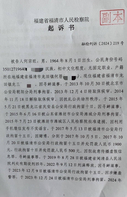何宗旺简介:1964年8月1日出生,福建省福清市人,药材经销商,“9‧12鞭炮大抓捕案”当事人,维权公民,人权捍卫者。因长期致力于为弱势群体维权发声,成为中共福建当局的维稳管控对象;2014年,曾因网上转发北京金水桥事件帖子而被警方刑拘37天;2015年起,曾因参与实地围观、4.29苏州拜祭林昭、到郑州旁听贾灵敏案庭审,及两次赴庆安围观徐纯合案等,被警方行政拘留10天;2017年10月4日,中共19大召开前夕,被福州警方刻意以涉嫌“赌博罪”行政拘留15天,随后又以涉嫌“参与赌博罪”再被行政拘留10天;2018年9月12日,因与多名福州维权公民迎接维权者严兴声刑满出狱,在福州第一看守所门口放鞭炮,而被福州市晋安区警方以涉嫌“寻衅滋事罪”刑拘;后又被以“编造、故意传播虚假信息罪”执行逮捕,羁押4个月后,又被闽清县检察院以涉嫌“寻衅滋事罪”及“传播造谣罪”起诉;2019年7月25日,其案在福州市闽清县法院开庭受审;2019年8月30日,终被该法院一审以“编造、故意传播虚假信息罪”、“寻衅滋事罪”判处有期徒刑4年;其不服上诉;后经福州市中级法院二审裁决,认为原审判决部分认定事实不清、证据不足,故撤销原判,发回重审;2020年12月4日,经福州市闽清县法院再次审案,依然维持原判;2022年9月12日,刑满释放;据悉,在潍坊看守所羁押期间遭酷刑虐待,曾被连续6天疲劳审,关押近三个月后脊椎囊肿爆裂,导致下肢瘫痪且大小便失禁,至今仍留下后遗症。此前在福建省福清监狱(福建省福州市福清镜洋镇下施村,邮政编码:350304)服刑。