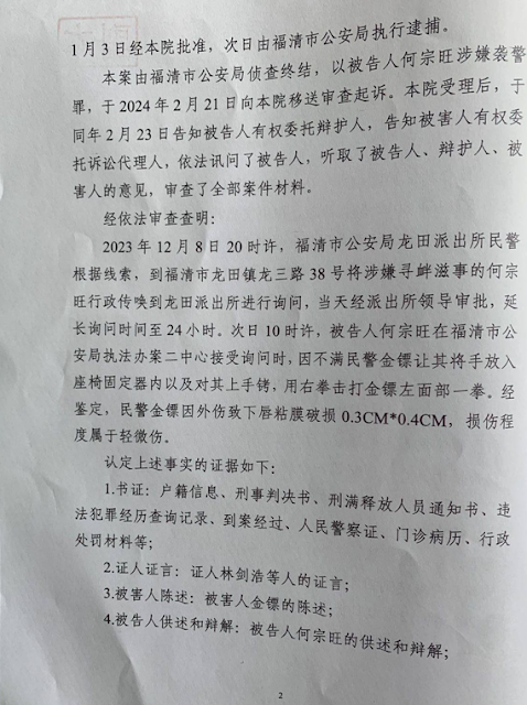 何宗旺被关押一个晚上,第二天10点,也就是12月9日,又让何宗旺做笔录,并给上手铐,何宗旺认为连传唤证都没有,只是询问,没有任何违法行为,不应该带手铐,一位警察强抓他的手,进行强制,何宗旺一甩,另一个警察也来强行给何宗旺带上手铐做笔录,又是问手机在哪?其中一个警察在9.12福州聚餐时到福州将其抓回龙田时也在现场。做完笔录之后,给了《行政处罚决定书》以9.12聚餐是寻衅滋事为由拘留15日,时间是2023年12月9日至12月24日。