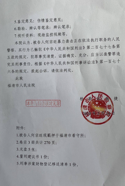 何宗旺15天行政拘留期满,又被以袭警罪刑事拘留,送入福清市看守所,后被批捕。何宗旺日前身体状况,血压高达210,有心梗病史,本来看守所不敢收,是公安局领导特批关押。曾经晚上病情发作,紧急抢救。目前服用降压药。原本他的脊柱落下残疾,看守所内日常生活无人照料,更加艰难。
