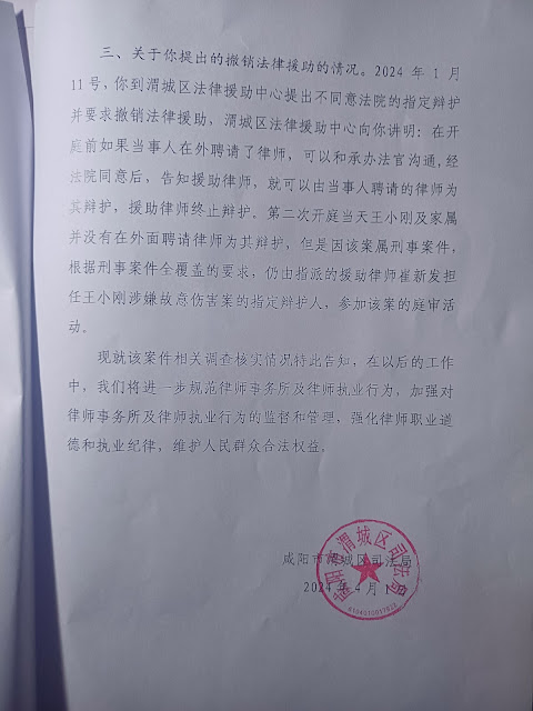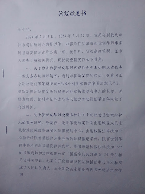 2024.4.3日,我收到了渭城区司法局做出的答复意见书。该答复意见书令人啼笑皆非。在崔新发律师与我做出完全相反的辩护意见,崔新发做有罪辩护,我做无罪辩护的情况下,渭城区司法局答复意见书竟对崔新发的辩护进行了高度肯定,将其的有罪辩护定性为有效辩护。而对于其占坑辩护的行为,司法局更是以当时王小刚没有辩护人为由,拒绝撤销其担任法律援助。但是,王小刚之所以没有辩护律师,就是因为渭城区法院拒绝接收我委托的西安本地徐律师的委托手续,以及接收了我新提交的委托邵晨阳律师的委托手续后又将其拒之门外,不允许邵律师依法参与办案。渭城区司法局和渭城法院一唱一和,法院拒绝收手续,然后渭城区司法局以没有律师为由,违法指派法援律师。二者配合的天衣无缝,就是为了要把这个冤案做成一个铁案,将违法的”占坑“进行到底。