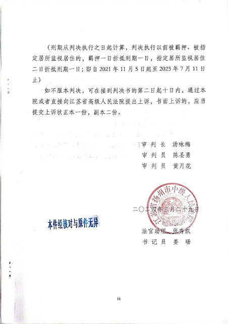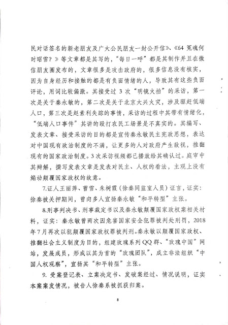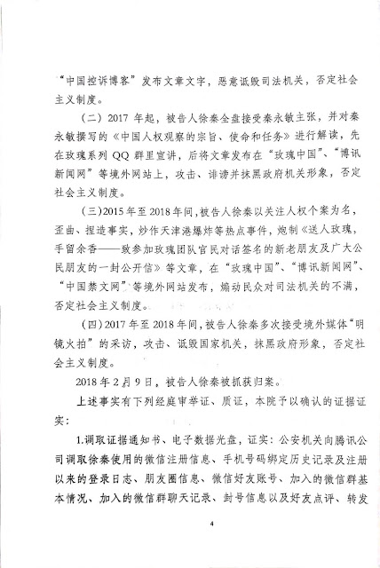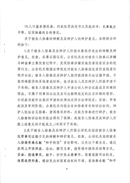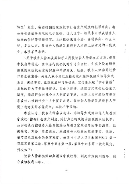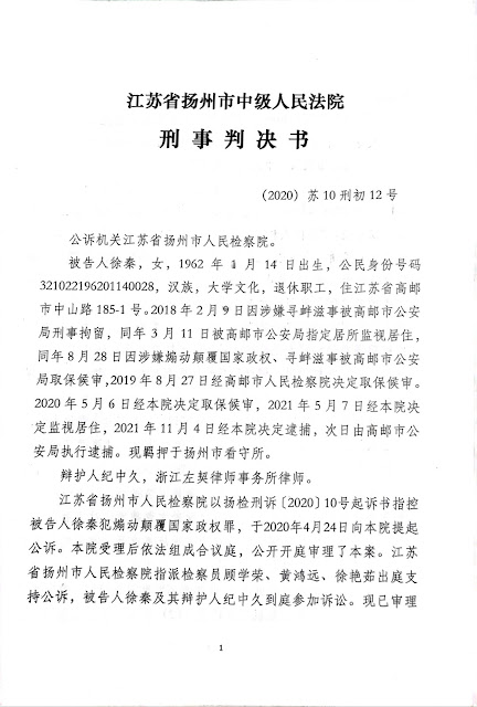 徐秦案终于在2024年3月29日上午于扬州市中级人民法院开庭宣判,法庭判决徐秦犯煽动颠覆国家政权罪,处有期徒刑4年,剥夺政治权利2年。刑期至:2025年7月11日。目前徐秦被羁押于江苏省扬州市看守所。