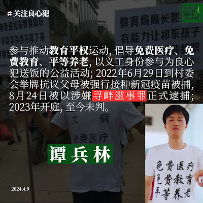谭兵林简介:湖南省衡阳市祁东县人,教育平权推动者,免费医疗、免费教育、免费养老(俗称“三免”)倡导者之一,维权公民,中国在押政治犯。近年来,曾因长期参与推动教育平权运动,倡导俗称“三免”的免费医疗、免费教育、免费养老的民生要求,以及以义工身份积极参与为良心犯送饭的公益活动等,而被社会正义人士和深受关怀帮助的弱势群体广为认可和赞许;