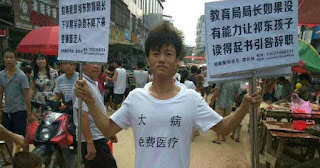 后祁东县教育局正副局长前来与其见面,就其举牌内容中提及的教育问题与其谈判;因其坚持向教育局长当面提出225个教育问题,终使对方被迫承诺回去后将就其中的16个问题进行研讨更新,届时必向其作答;然而时至9月12日,其因一直未见教育局副局长所称的“不在学校吃饭的学生可以退伙食费”之公示,遂其前往步云桥3所学校进行调查取证,结果不仅均未看到退款公示,反而遭到3所校方人员的驱逐和拒绝;而与此同时,却有学生家长听闻其做实地调查,就向其反映说,学校里每天都卖垃圾食品,严重影响了孩子的身体健康,但校方却为自身利益而任由其发展;鉴此,其立即特发声明,呼吁和要求教育局务必让各学校在校门之外张贴退伙食费公示,否则其将于次日恢复上街举牌;