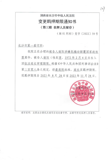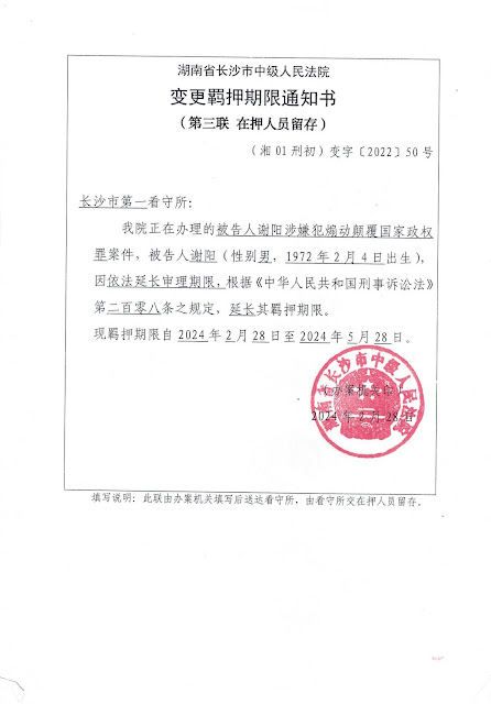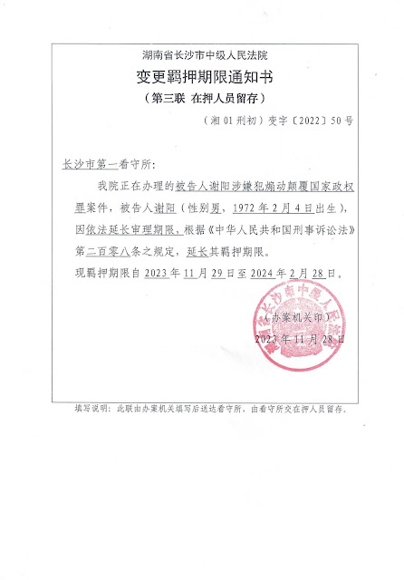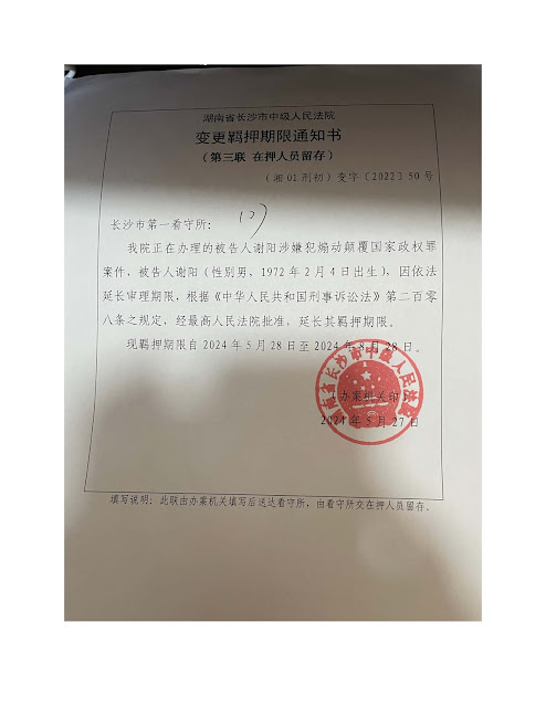 陈桂秋女士今天通报:“谢阳律师被非法羁押第924天。辩护律师 李贵生律师拿到了延长羁押的通知书,一共9次,长沙市公安局一次,长沙市检察院一次,长沙市中级人民法院七次。可笑的是,自2022年11月29日–2024年5月27日,长沙市中级人民法院所出具的七张纸的右上角,写的都是“(湘01刑初)变字[2022] 50号”。 在2022年11月29日和2023年2月28日,所出具的两张纸的最上角,写的是“长沙市第一长沙市中级人民法院”。中国哪个地方可以找到这么一个单位?他们联合起来造假的水平,真的是低!