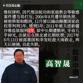 高智晟律师是中国大陆著名人权律师,以其刚正不阿、铮铮铁骨而著名,历经残暴酷刑而不屈服,高智晟律师已遭强迫失踪长达近七年,中共当局至今没有任何法律手续和说明,其处境与生命安危令海内外各界高度担忧。请世界各地人权人士继续一起为高智晟律师的自由而行动。