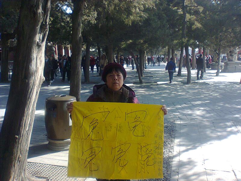 受欺骗之苦的以上福州8冤民,在气愤之余,今天(3月12日)集体去逛北京皇家御园颐和园和圆明园。大家本想游览一下,放松心情,但在游览时,还是不忘喊冤,或集体拉横幅给路过的游客倾诉冤情。