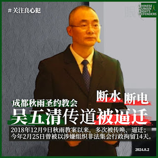 吴五清传道一家现租住在成都市温江区涌泉街道金科天宸小区。有关部门为将吴五清传道一家从现在的住处赶走,自2024年7月25日开始,他的住处被停电,7月29日被停水,8月7日被停气(经投诉,1天后恢复供气)。