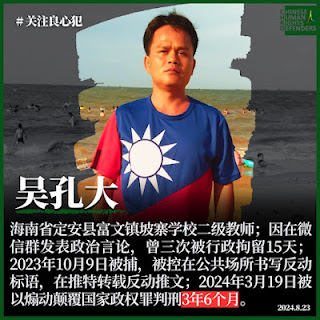 多年来吴孔大长期关注并转发民主宪政维权方面的信息,并多次对学校和政府提意见,遭迫害。2023年6月底,吴孔大因在微信群转发人权律师王全璋、李和平被逼迁、何方美案等良心犯情况,被当地警方带到派出所,随后又被行政拘留15天。