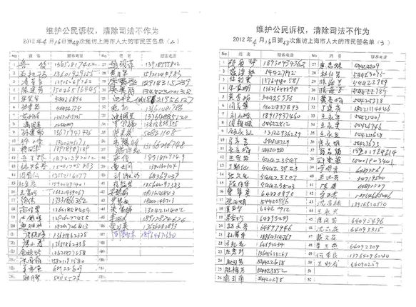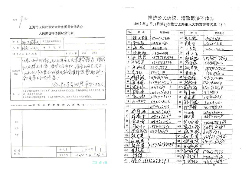 2012年4月16日下午2:30分,上海市民为了捍卫法律,代表1060户家庭向上海市人大常委会第48次请愿。请求维护国家尊严,以事实为依据,以法律为准绳,让权力在阳光下运行,消除上海司法不作为的恶习!同时请求上海市人大履行法定职责,监督一府两院的工作。