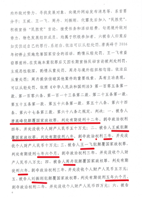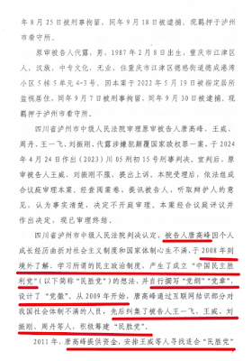 2024年6月19日获悉,其等6人涉嫌颠覆案被四川省泸州市中级法院一审分别宣判,其被以「颠覆国家政权罪」重判有期徒刑12年,剥夺政治权利4年,没收个人财产50万元;另有其他5人,亦被以同罪名重判8年—3年不等刑期;其等不服,均提起上诉;2024年12月2日,经四川省高等法院二审裁决,其等均被驳回上诉,维持原判,其个人刑期预至2035年1月。