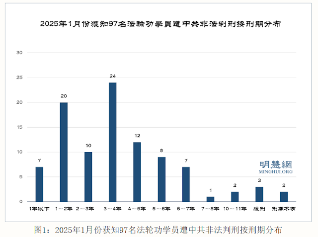 (维权网信息中心报道)2025年2月5日,本网据明慧网报道统计:2025年1月新年期间获知,又有97名法轮功学员被中共非法判刑,有55人被非法判三年以上重刑。河南漯河市法轮功学员杨俊成、丁香芹夫妇,2023年9月被中共警察绑架、非法关押构陷,近悉,夫妻俩被非法判十年。有43名60岁以上老年学员被非法判刑。其中,80~90岁2人,70~80岁19人,60~70岁22人。他们中有的曾经是市检察院书记员、市体委工作人员、市广播电视局干部、市工商局干部、兰州交通大学老师、军医大学研究生、退休教师、医院干部、银行职员、会计等社会各行各业的精英人士。