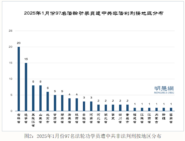 非法判刑分布于中国大陆二十二个省、自治区、直辖市。迫害最严重地区依次为:吉林省20人,辽宁省15人,黑龙江省8人,山东省8人,北京市6人,甘肃省5人,湖南省5人。