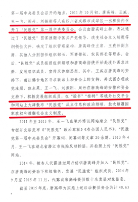 2011年10月初,中国民主胜利党宣布成立,并在四川省成都市一处出租房内秘密召开了第一届中央委员会,因其积极参与其中,故成为该党派核心成员之一;由于会议中通过了旨在推翻中国共产党领导,改变制度等纲领性文件,确立了组织管理架构等,故在会后,在已担任「民胜党」主席唐高峰的出资支持下,其等所有核心成员开始依照该党的政治纲领及部署,赴境外积极宣传、发展组织成员和发表反独裁体制的言论思想2011年-2016年期间,其与王威、王一飞、刘振刚、代露等核心与骨干成员为使该党派组织发展卓有成效,就在脸书(Facebook)和推特(Twitter)等多个国际网络平台宣传“民胜党”成立的信息和纲领宗旨,并不断发展新成员;2016年初,因国内政治氛围变得日益紧张,唐高峰开始与其等人陆续断开联系,停止提供活动经费,但其仍于2016年4月底经他人推介赴境外参加组织培训,与海外民主阵营的部分组织进行广泛交流,继续宣传与发展着「民胜党」的成果;