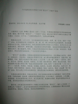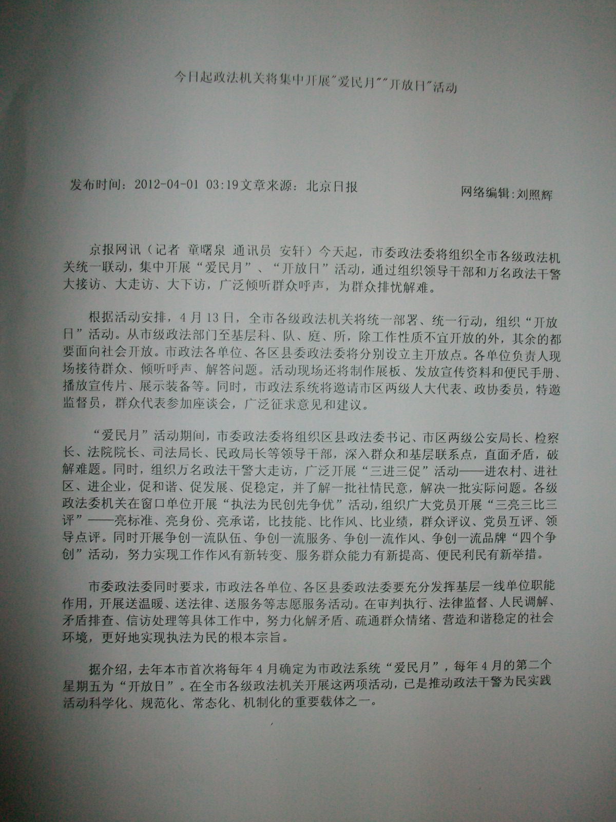 按照北京日报4月1日的报道,北京市政法委在全市开展“爱民月”和“开放日”活动,由各个政法机关下的公安局长、法院院长、检察院长、司法局长等一把手要接待群众,听取群众的意见建议,积极化解矛盾,建设和谐社会。