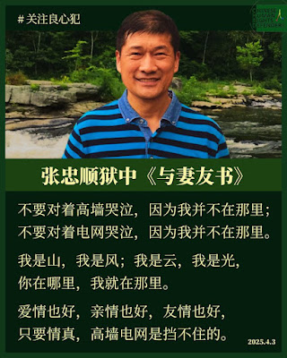 (维权网信息中心报道)2025年4月4日,本网获悉:被判刑4年6个月的“厦门公民聚会案”当事人、人权捍卫者张忠顺 的狱中《与妻友书》,真挚感人。