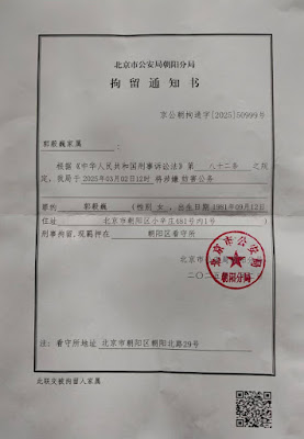 2025年3月2日,又是中共“两会”召开日,其因再度到朝阳区东风乡政府请求解决其信访投诉问题,遂其被北京市朝阳区警方立即以涉嫌“妨害公务罪”刑拘;同年4月8日,其被北京市朝阳区检察院更换罪名,又以涉嫌“寻衅滋事罪”予以批准逮捕。目前被羁押于北京市朝阳区看守所(北京市朝阳区朝阳北路29号,邮政编码:100024)。