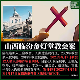 (维权网信息中心报道)2025年4月20日,本网获悉2025年4月18日山西临汾金灯堂教会杨荣丽传道、王晓光牧师4月18日庭审简况,现在通报如下: