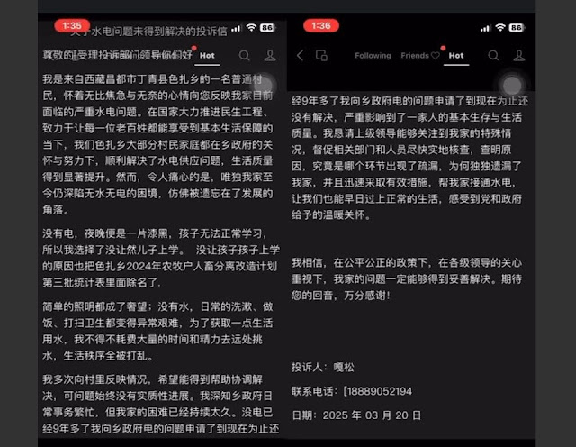 从2016年至2025年初,嘎松向县和乡政府等提交了5次书面申诉。嘎松在2025年3月提交的申诉中,再次详述了这些困难,但政府一直未给予回应。他于3月20日通过社交媒体讲述了他家庭面临的困境,引起了强烈反响。3月24日,嘎松被丁青县警方以破坏社会秩序和损害党和政府形象为由,拘留三天。