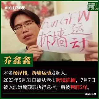 (维权网信息中心报道)2025年6月2日,本网获悉:遭中共当局跨境抓捕、后获刑5年拆墙运动发起人、新闻媒体人杨泽伟(网名乔鑫鑫)入狱已经整整2年。其在六四34周年纪念日前夕的2023年5月31日,突遭中国警方跨境抓捕;后知其在当地侨领、老挝警方的连手配合下被中国警方野蛮绑架,自此失联,后证实其已被押回湖南衡阳,羁押在湖南衡阳市未成年人看守所。杨泽伟于2023年是7月7日被衡阳市检察院批捕,其罪名是“煽颠颠覆国家政权罪”。后获悉,一审获刑5年,已于2024年9月移送湖南赤山监狱服刑。