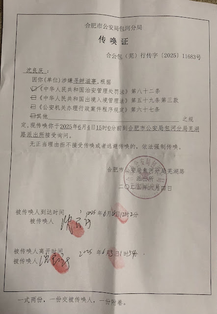 门打开后,一位似曾相识便衣手持传唤证告知他们是芜湖路派出所警察,两名便衣持执法记录仪拍摄。他们主动出示了警官证。因没戴眼镜,脑子里又在判断对方意图。这个时间喝茶突然变成传唤,虽是特殊日子维稳,目的是要拖到翌日零点放人,略施薄惩兼封口,抑或其他可能?实际上,8时发了用黑底白字抄录于右任《望大陆》最后一段区区十二字后,我已不愿再开口。因此装模作样朝警官证扫了一眼,根本没看清对方姓名。后来在派出所跟带队的闲聊时,他说大前年二十大前夕曾陪市局和分局老熟人一道去安庆看望我妈妈,还在一起吃过饭。我才想起应是接替黄升云的芜湖路派出所负责政保工作副所长。他不承认,说是做其他工作,这次抓我跟政保和老熟人工作无关,纯粹因为上边转来一则涉嫌网络造谣寻衅滋事帖子,显得过于谨慎和轻视人民群众智商。