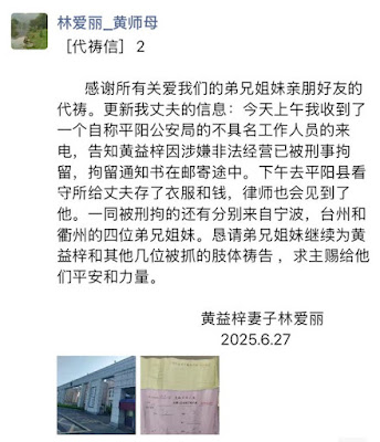2014年因反对浙江温州当局强拆教堂十字架,被以聚众扰乱社会秩序罪判刑一年的温州平阳黄益梓牧师,于2025年6月26日早9时再次被平阳公安和鹿城国保带走,初步被告知涉嫌非法经营罪。同时被抓捕的还有教会的4名同工。目前获悉,黄牧师和另外四位同工已确定被刑事拘留,律师已会见到黄益梓牧师,目前黄益梓被羁押在平阳县看守所。