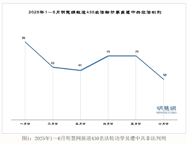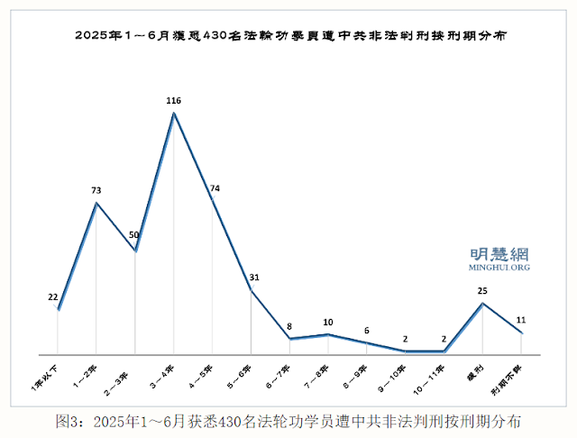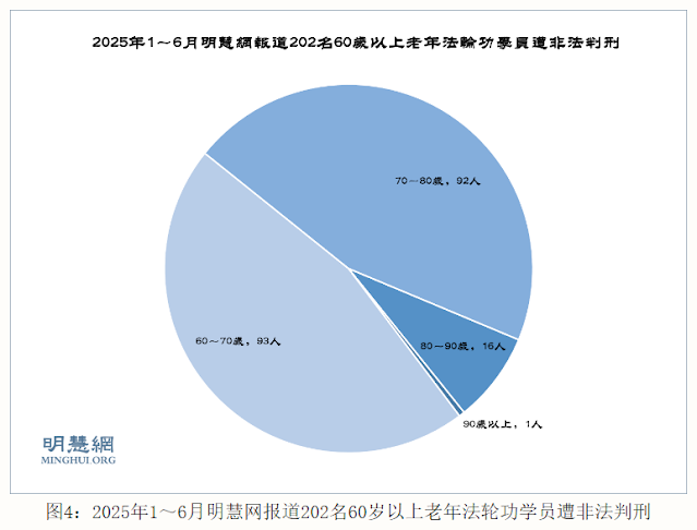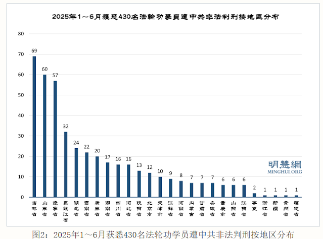 据明慧网报道统计,二零二五年一至六月份又获知至少430名法轮功学员被中共非法判刑(2025年249人,2024年151人,2023年14人,2022年6人,2021年3人,2020年3人,其他年份4人)。他们中有:省边防总队纪检办主任、市检察院书记员、优秀教师、医生、护士长、大学图书馆管理员、高级工程师、银行干部、质检部主任、军医大学研究生、会计、画家、农民、工人等社会各界人士。有202名60岁以上老年法轮功学员遭非法判刑,其中,90岁以上 1人,80~90岁16人,70~80岁92人,60~70岁93人。