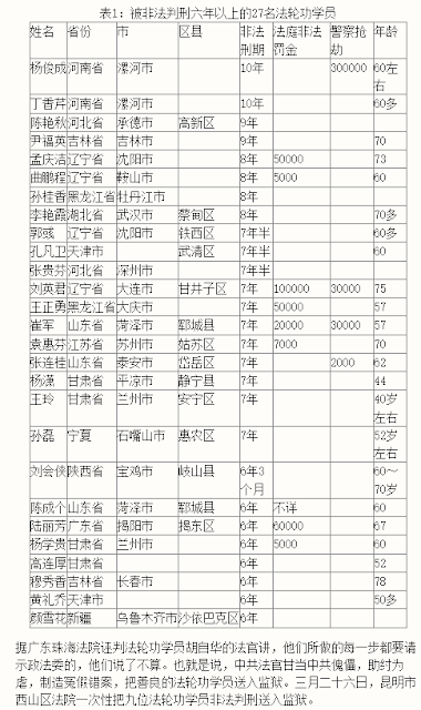 非法判刑分布于中国大陆二十六个省、自治区、直辖市,迫害最严重的前十名的依次为:吉林省69人,山东省60人,辽宁省57人,黑龙江省32人,湖北省24人,云南省22人,广东省20人,湖南省17人,四川省16人,河北省16人。249人被非法判三年以上重刑,占57.9%。其中,二人被非法判十年。有153名学员遭中共非法判刑的同时被处以罚金210万2千5百元。有15名法轮功学员遭警察敲诈勒索106万5千5百元,共计人民币316万8千元。