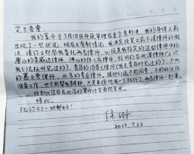 (维权网信息中心报道)2025年7月27日,本网获悉:两个月前就传出广州民主人士、词曲作家、人权捍卫者徐琳狱中身体暴瘦、骨瘦如柴。多项身体指标异常,其钾、钙指标偏低,有心窦性心脏病。7月22日其向妻子写出家书,内容主要是:一、身体健康堪忧;二、3月18日开庭审理后一直不判决审;三、需紧急委托两名律师,指定:李威达律师(唐山)、陈小成律师(佛山)、吕洲滨律师(杭州)、汤青云律师(青岛)、葛文秀律师(广州)、李庄律师(北京),希望其中任何两人一起前来探视。