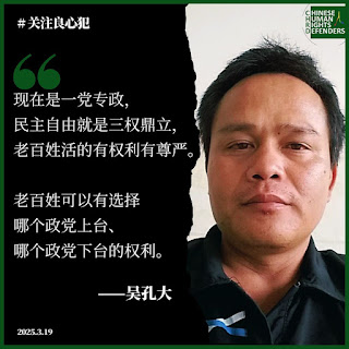 吴孔大:1975年11月25日出生,微信网名(天会再蓝、海棠血泪、尧山魂),原海南某小学教师,因不放弃在网络议政权利以及曾在公共场所书写抗议标语,以煽动颠覆罪被判刑3年6个月,刑期至2027年4月9日。目前关押海南省(美兰区演丰镇)美兰墟监狱六监区服刑,邮编571129,监狱狱政科电话0898-65748033.