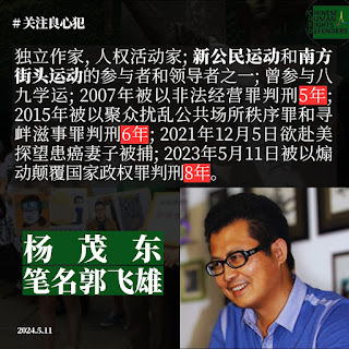 杨茂东简介:笔名郭飞雄,1966年8月2日出生,湖北省谷城县人,律师,独立作家,新公民运动和南方街头运动践行者,著名人权活动家,中国在押政治犯。