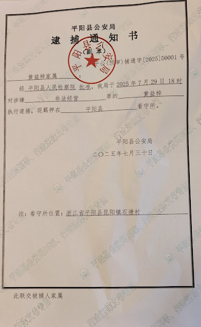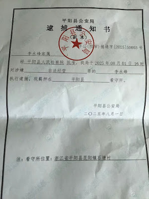 2025年6月26日,再度被平阳县警方入室强行带走,家遭查抄,后被以涉嫌“非法经营罪”刑事拘留;同天,另有4位教会基督徒也被一起带走,现都被以同罪名刑拘;据悉,现代理律师已与其会见。目前被羁押于温州市平阳县看守所(浙江省温州市平阳县昆阳镇平塔村,邮政编码:325400)。