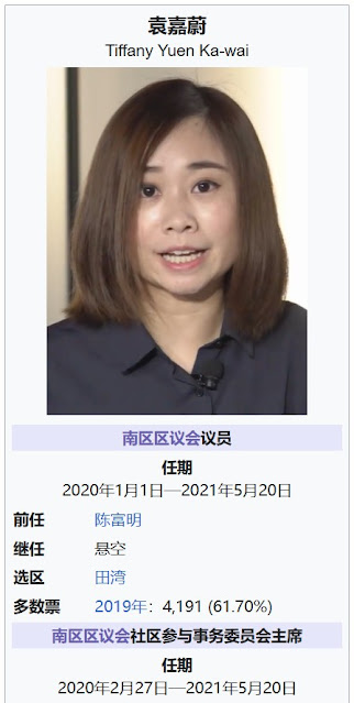 袁嘉蔚简历:1993年9月30日出生,英文名Tiffany Yuen Ka-wai,绰号“田湾女孩”,英国籍和中华人民共和国(香港)籍人,香港南区万事屋(民主派的小区团体)成员,原香港南区复康活动及长者友善小区工作小组副主席、南区平等机会工作小组主席及南区区议会小区参与事务委员会主席,香港众志(已解散)前副主席,前南区区议会田湾选区议员,泛民主派人士。