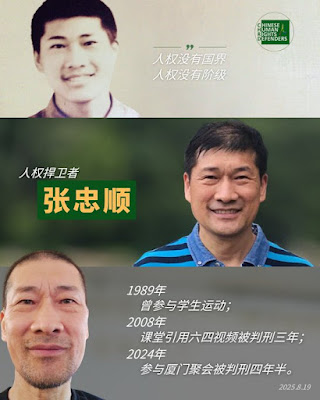 (维权网信息中心报道)2025年8月20日,本网获悉:2025年8月19日是被以“颠覆国家政权罪”、“私藏枪支弹药罪”判刑4年6个月的“厦门公民聚会案”当事人、人权捍卫者张忠顺58岁生日,其在狱中度过了自己58岁的生日。张忠顺因参与厦门聚会,2024年被判刑4年6个月;目前在山东省济滕监狱服刑。