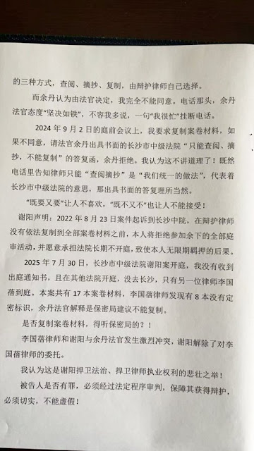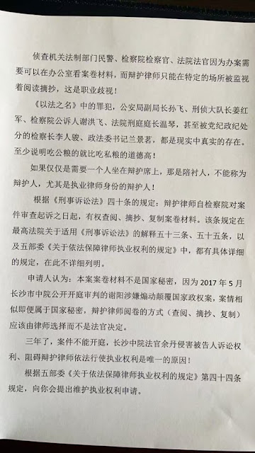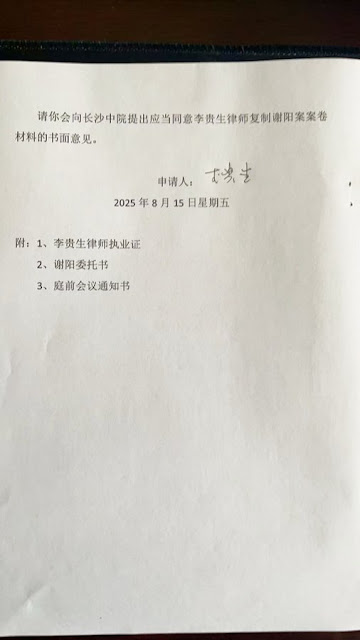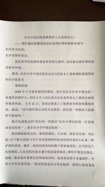 据陈桂秋今天通报:谢阳律师的辩护律师李贵生,向长沙市司法局、长沙市律师协会提交维权申请书。