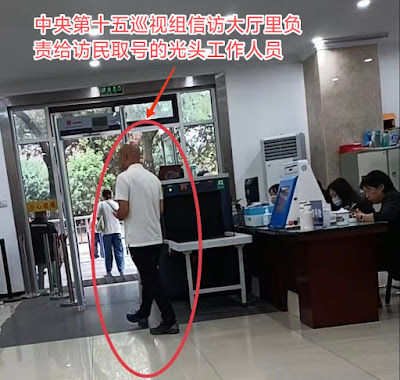 进入信访接待大厅过完安检,有个光头工作人员负责发号,此人看到有领导提前打过招呼的大案要案访民后会不择手段百般刁难不给发号,即使发了号也会派人提前到接待室打招呼不让工作人员给其登记。