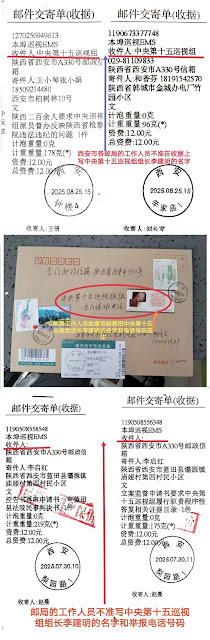 2025年7月30日起有访民到西安各邮局给中央第十五巡视组李建明组长邮寄案件材料,被邮局工作人员告知信封和特快专递回执单上不允许写李建明收,也不准写巡视组电话号码,只准写西安市A330号邮政信箱收。并称是政府领导专门交待的。