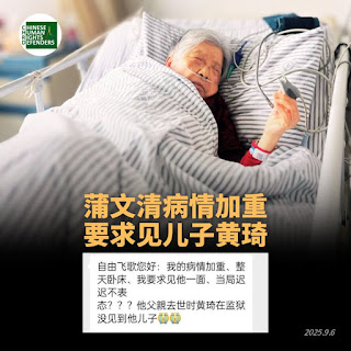 (维权网信息中心报道)2025年9月7日,本网获悉:获刑12年、现年62岁的著名人权捍卫者黄琦的91岁的老母亲蒲文清今年两次因病入院,目前“病情加重、整天卧床”,再次要求当局准许她会见儿子黄琦。