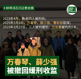 (维权网信息中心报道)2025年9月10日,本网获悉:安徽蚌埠活石归正教会教案中薛少强被判刑2年6个月,缓刑四年,罚金三千;万春琴被判刑2年6个月缓刑2年,罚金三千。二人早在2025年1月8日被取保释放,2025年3月27日,二人被判缓刑;9月5日法院又突然撤回缓刑,将二人被再次收监。