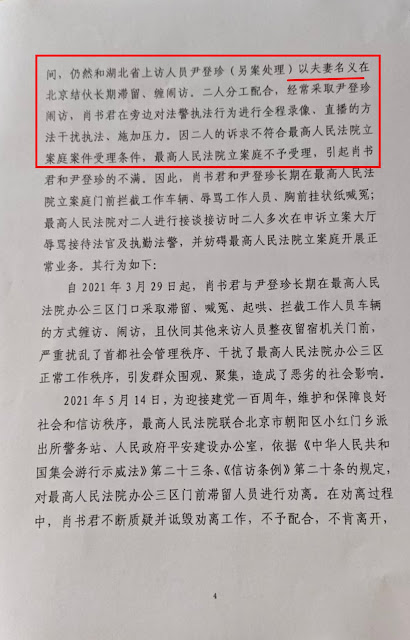 ·判决书中称“肖书君和尹登珍以夫妻名义在北京结伙长期滞留、缠访闹访”。但事实是二人自2013年相恋共同生活12年,因湖北十堰、黑龙江同江两地政府阻挠导致至今未能登记结婚。