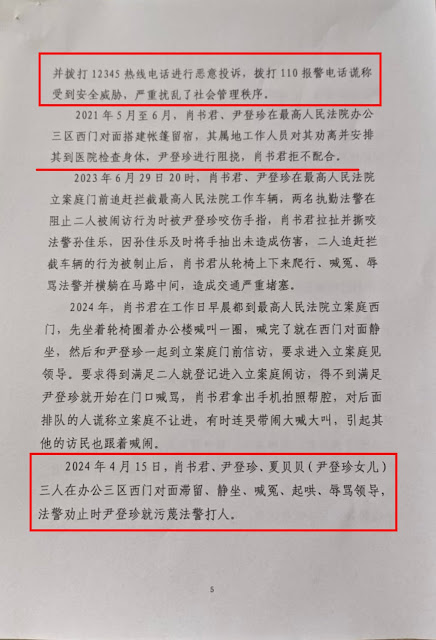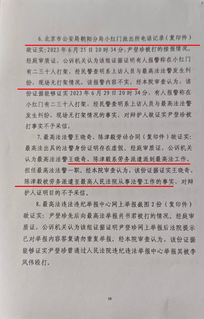 2、 2023年6月29日,尹登珍、肖书君被最高人民法院多名保安殴打,导致尹登珍肋骨骨折、全身多处伤,肖书君全身软组织多处受伤、冠心病、癫痫病发作被送进医院抢救。同江市人民法院采信病例报告,但仍否认两人在最高人民法院被殴打,并出具北京市公安局朝阳分局小红门派出所提供的证据称“民警查明系上访人员与最高法法警发生纠纷,现场无打架情况”。