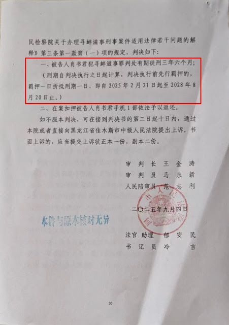 (维权网信息中心报道)2025年9月13日,本网获悉:9月4日,尹登珍二审秘密宣判当日,肖书君“寻衅滋事罪”案一审宣判,其被判处有期徒刑3年6个月,自2025年2月21日起至2028年8月20日止。