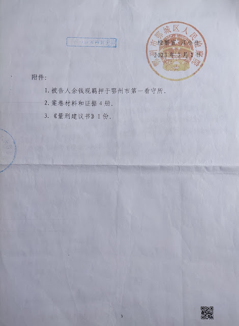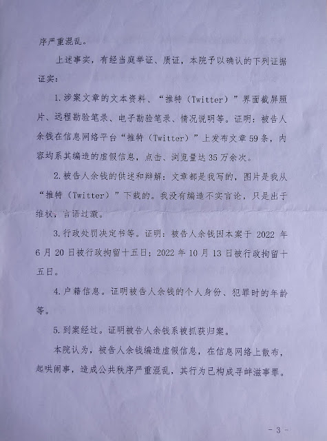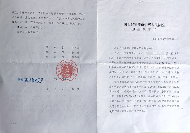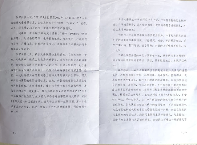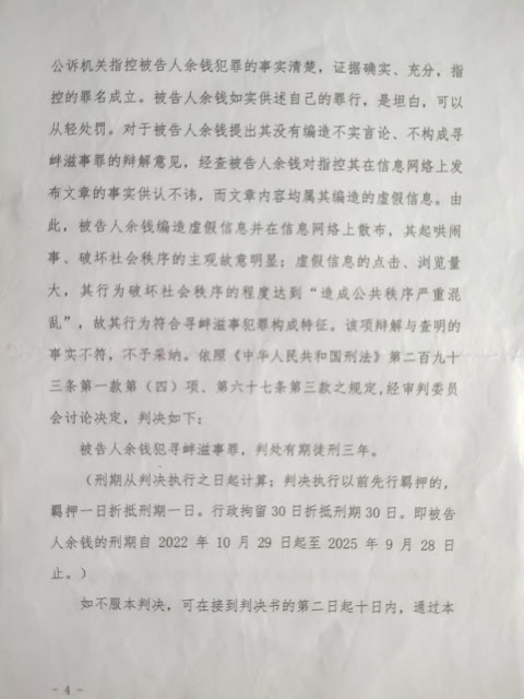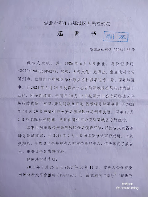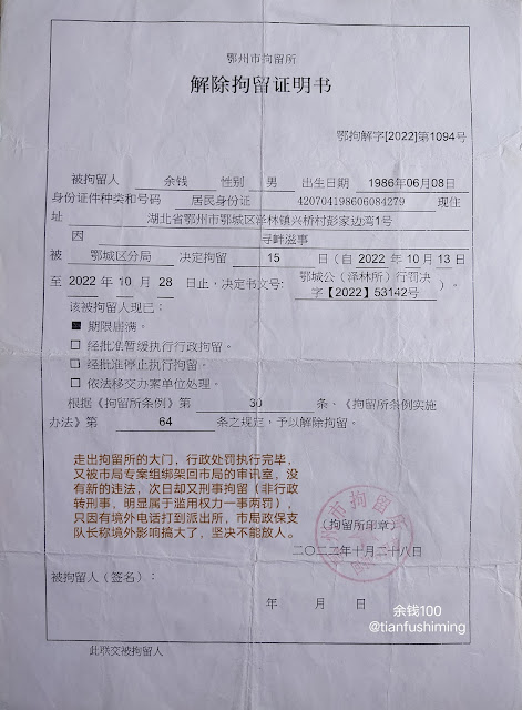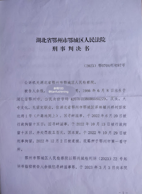 后获悉,余钱已因推特言论尤其抗议疫情封控,先被行政拘留15天,期满后走出拘留所即再被抓;2022年10月29日被以寻衅滋事罪名刑事拘留,羁押在鄂州市第一看守所;12月2日被逮捕,后被以同一罪名判刑三年,已于2025年9月底刑满出狱(说明:他曾被行拘的日期折抵了刑期)。