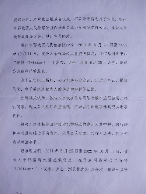 根据起诉书,鄂州市鄂城区检察院指控余钱在社交平台推特上“采用‘低级红高级黑’等隐晦或具有明确指向的方式,大量散布涉及新冠肺炎疫情防控、曲解国家政策、诋毁中国执政党、中国政府及党和国家领导人的虚假信息,混淆视听,造成公共秩序严重混乱“,并指余钱发布推文共59条,曝光次数超过35万次。