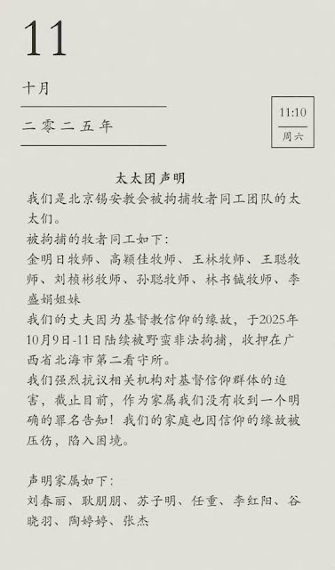 我们的丈夫因基督教信仰的缘故,于2025年10月9日-11日陆续被野蛮非法拘捕,收押在广西省北海市第二看守所。