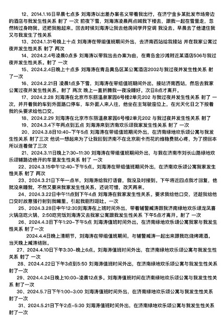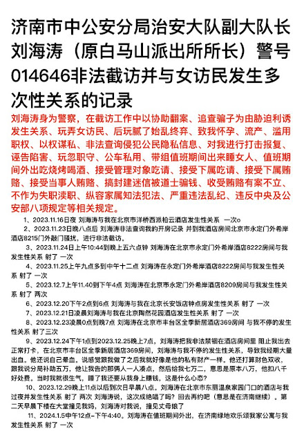 (维权网信息中心报道)2025年10月18日,本网获悉:2025年10月16日,山东济南女访民赵爽在网上实名公开举报济南市公安局市中区分局治安大队副大队长刘海涛(警号014646),控诉刘海涛身为警察,在截访过程中以协助翻案、追查骗子为诱饵,胁迫利诱其发生性关系并长期玩弄、致其怀孕流产;刘海涛滥用职权、以权谋私、非法查询侵犯其公民隐私信息、对其进行打击报复、诬告陷害;刘海涛玩忽职守、公车私用、带组值班期间出来睡女人、值班期间外出喝酒吃烧烤、接受管理对象吃请、接受下属吃请、接受下属贿赂、接受当事人贿赂、搞封建迷信被道士骗钱;刘海涛收受贿赂有案不立、不作为、失职渎职、纵容家属知法犯法、严重违法乱纪。