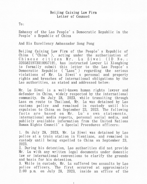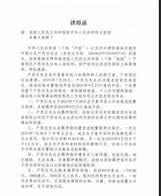 中华人民共和国(下称“中国”)北京才兴律师事务所接受中国公民卢思位先生(身份证号码:320582197301095719)的委托,指派黎雄兵律师就老挝人民民主共和国(下称“老挝”)严重侵犯卢思位先生的人身权利、财产权利以及违反国际义务等情形,特此致函。