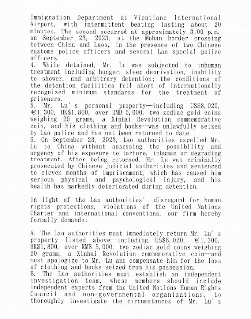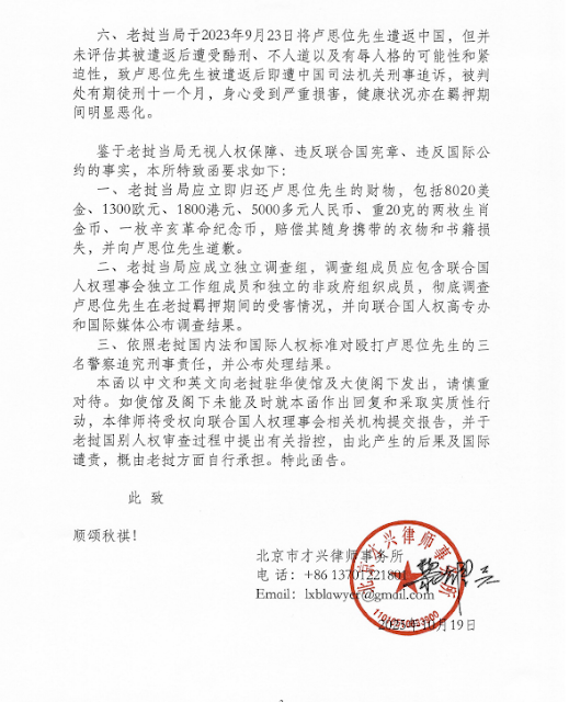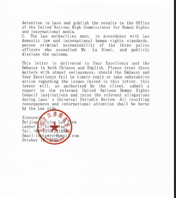 本函以中文和英文向老挝驻华使馆及大使阁下发出,请慎重对待。如使馆及阁下未能及时就本函作出回复和采取实质性行动,本律师将受权向联合国人权理事会相关机构提交报告,并于老挝国别人权审查过程中提出有关指控,由此产生的后果及国际谴责,概由老挝方面自行承担。特此函告。