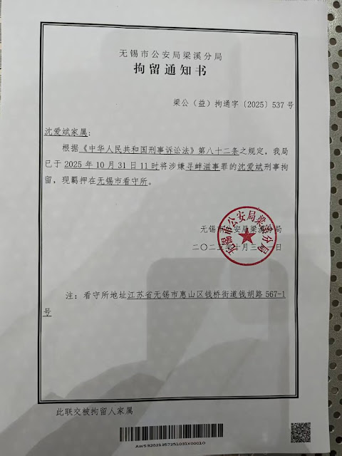2025年10月27日下午,江苏无锡维权人士沈爱斌在无锡市公安局锡山分局东亭派出所,被该所副所长戴沣(警号221928)指使警察暴力殴打,送医确诊鼻梁骨折,头部外伤,后送在无锡市江南大学附属医院住院。2025年10月31日上午11时,沈爱斌又被无锡市公安局梁溪分局以寻衅滋事罪被刑事拘留,并抄家。随即被羁押至无锡市看守所。