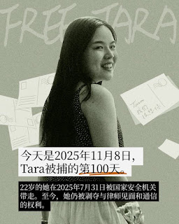(维权网信息中心报道)2025年11月8日,本网获悉:今天是2025年11月8日,是张雅笛Tara被捕的第100天。